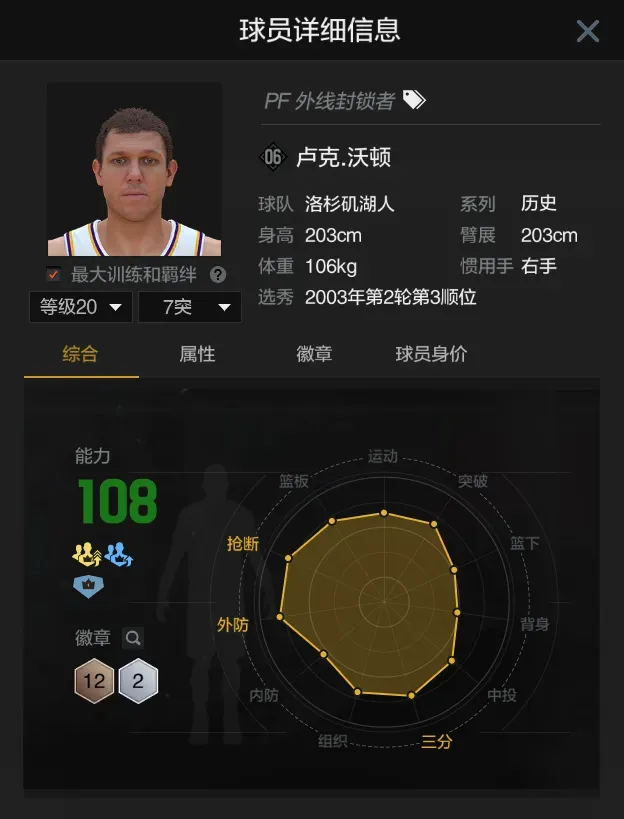 第九位卢克沃顿,当前满突身价七百多万,有投射有防守,解锁双篮板动画,还拥有应变大师和护球大师等在内的组织型徽章,目前是比较优质的平民街头二号位球员。