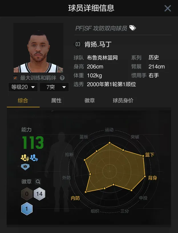 第七位肯扬马丁,当前满突身价七百多万,终结能力出色的侧翼球员,基本没有三分投射能力,篮板球表现也比较差,整体而言娱乐意义大于实用性。
