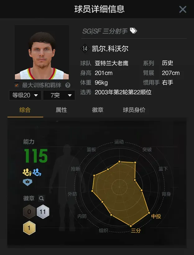 第三位凯尔科沃尔,本届历史三位拥有金徽章的球员之一,坐拥金色接球投篮手和豪华投射徽章,顶投能力强,乔丹运球风格,可以作为四外持球手使用,引擎升级后游戏强度甚至有所提升。