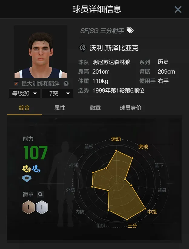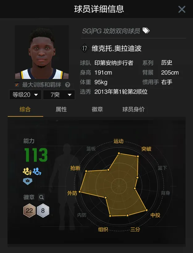 第六位维克托奥拉迪波,当前满突身价一千多万,具备一定防守能力的小模型后场,拥有银色的死亡缠绕和挡拆躲闪者徽章,进攻端三分球数值偏低,体力也只能打两节比赛时间time,作为主力持球手使用有些尴尬。