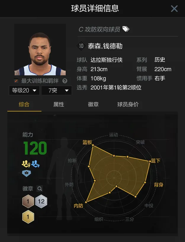第二位泰森钱德勒,当前满突身价五千多万,模型宽厚,坐拥金色铜墙铁壁徽章,弹跳过线,解锁双篮板动画,具备不错内防表现,虽然横移速度并不快,但仍然是平民优质的站桩型内线。