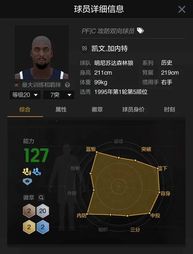 之一位凯文加内特,当前满突身价两亿以上,游戏里顶级的内线选项,运动能力强,轻松解锁双篮板动画,有投射有护筐,装备时刻狼族领袖可以解锁篮下快起高手徽章,非说缺点的话那就是横移速度偏慢,投篮包容易受到干扰。