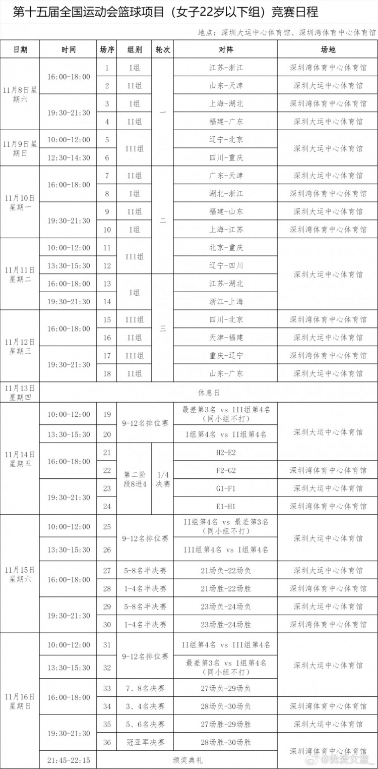 全运会女篮完整赛程出炉 大部分球队5天内打3场小组赛