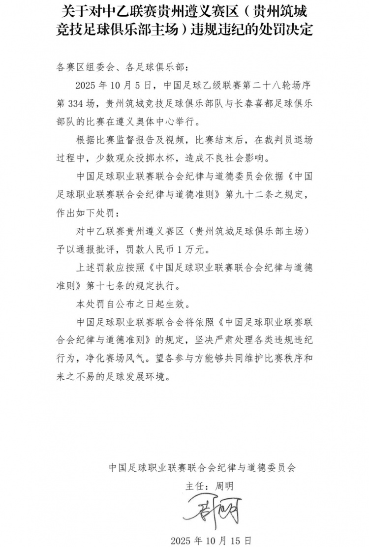 因观众向裁判投掷水杯,贵州筑城主场被中足联罚款1万元