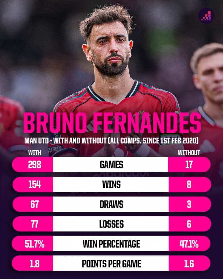 B费在场曼联胜率51.7%场均1.8分,缺席胜率降至47.1%场均1.6分