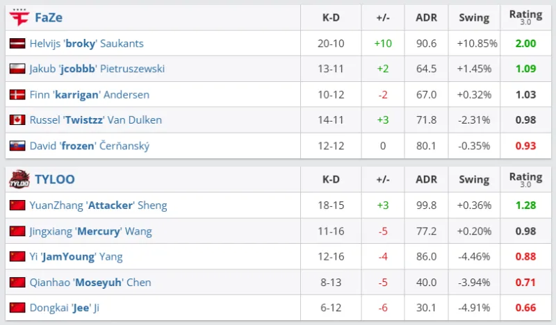 下半场易边再战。手枪局失利后,TYLOO强起提速进攻链接包夹A区成功翻盘。第十七局,双方香蕉道互换道具后TYLOO爆弹B区,FaZe重防A区战术失败,TYLOO拿下长枪局。TYLOO静音接触A二楼进攻A区被broky大狙首杀侦查战术失败,FaZe拿到五个赛点。最终,图二TYLOO 7-13 FaZe,自选图不敌对手。大比分1-1,双方进入决胜图Mirage。