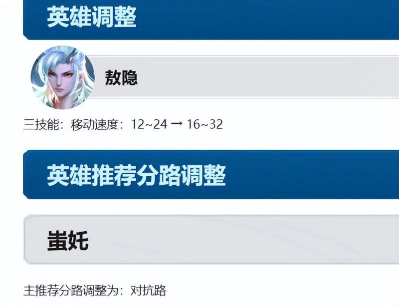 英雄调整敖隐的加强实装,但一起调整的花木兰还没有,蚩奼的主分路从打野变成了对抗路,目前的确是对抗路的占比更高,要是以后能降低一点蓝耗就好了。