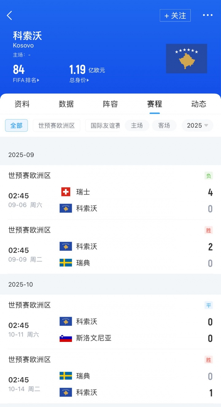 【赛#事说明】:【遭科索沃双杀!瑞典FIFA排名2个月狂跌11位 身价5.16亿欧世界第10】直播准时 *** ,喜欢看世界杯非洲区预选赛比赛的朋友可以提前收藏本页面以免错过直播。足球直播还为您在本页面索引了相关【遭科索沃双杀!瑞典FIFA排名2个月狂跌11位 身价5.16亿欧世界第10】直播的近期比赛列表以及两队历史交锋、两队赛程。