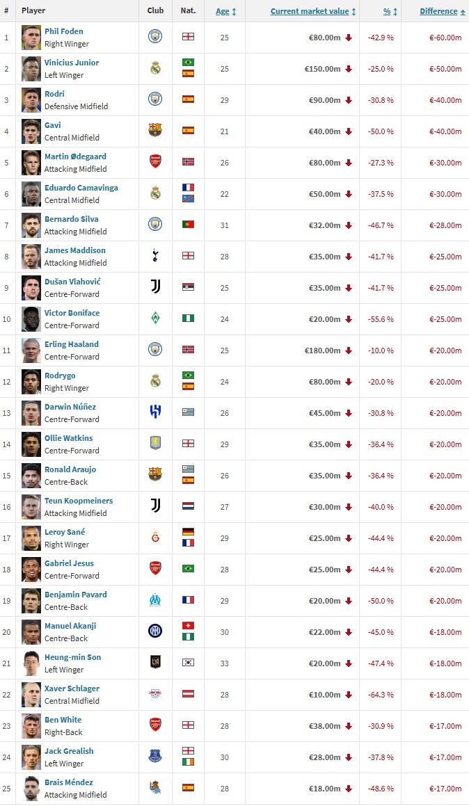 1.福登(曼城):现身价8000万欧元,身价下降6000万欧元,降幅42.9%