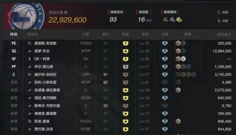 今天带来的76人经理队套分享。号主在10天前还是其他阵容,胜率并不高,于是选择76人队球员组建了一套2000万阵容,经过10天鏖战,晋级赛一次过打上超巨