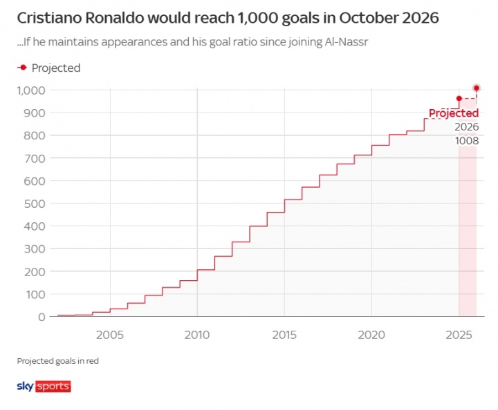 94.9%!天空:C罗有望在1年内成为足坛历史上首位1000球球员