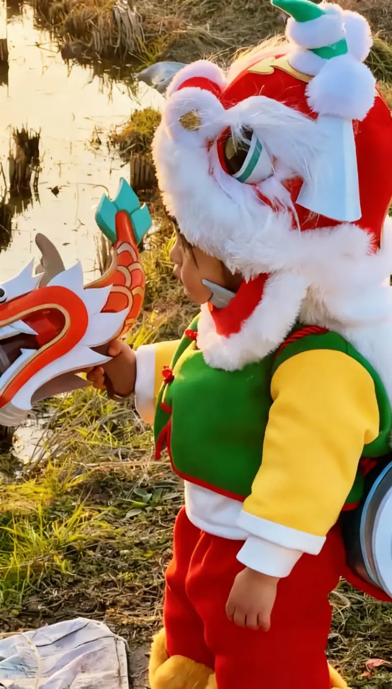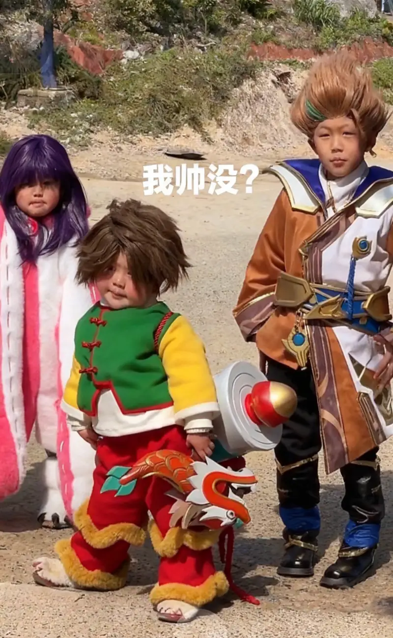 所以小孩子们在新年的时候cos鲁班,不仅喜庆还很可爱。能看到瑶一瑶身穿一身红色的棉裤,青色的棉衣,袖子是黄色的,头上还戴了鲁班同款虎头帽,毛绒绒的超级可爱。