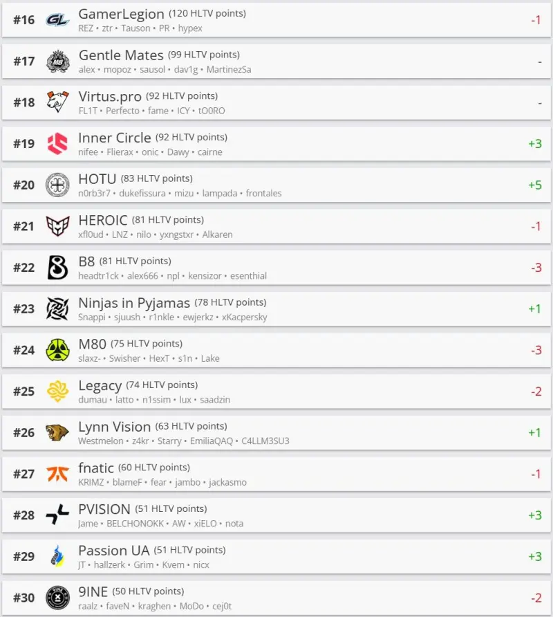 中国队伍方面,TYLOO小幅进步来到第15名,LVG也赶超前进一名到第26名,RA则再次下滑至第68名。