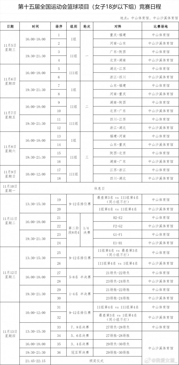 全运会女篮完整赛程出炉 大部分球队5天内打3场小组赛