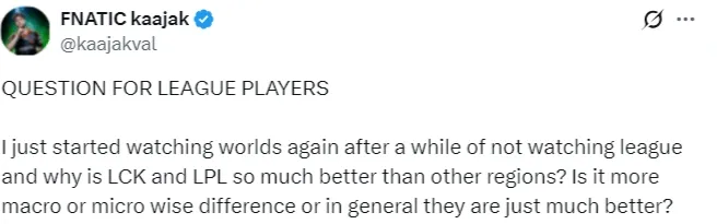 [雷火官网]FNC瓦选手kaajak提问:为什么LCK和LPL比其他赛区强很多?