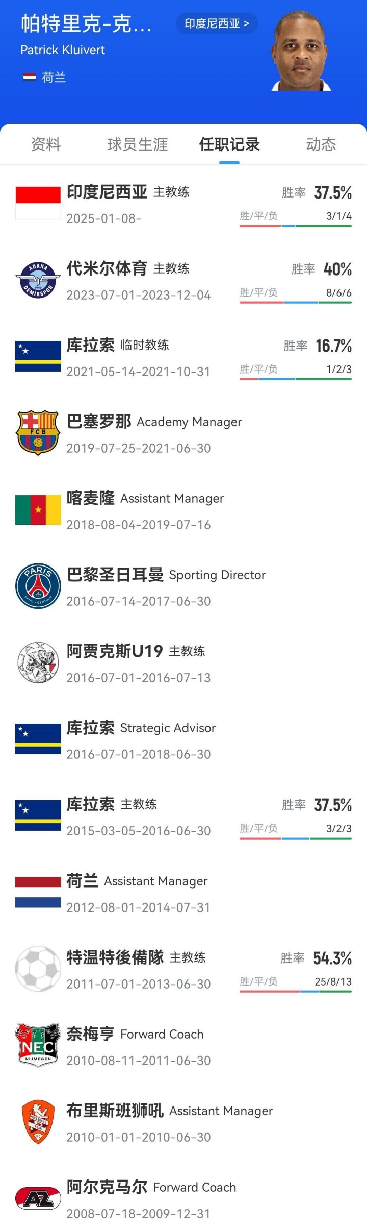 克鲁伊维特现年49岁,球员时代他是足坛更优秀的射手之一,曾效力阿贾克斯、AC米兰、巴萨等队,退役后曾担任喀麦隆助教、库拉索 *** 主帅。他执教印尼前唯一一段正式主帅经历是2023年7月起担任土超代米尔体育主帅,20场比赛8胜6平6负,执教5个月便下课。克鲁伊维特还担任过荷兰国家队主帅范加尔的助教,帮助球队在2014年巴西世界杯获得季军。