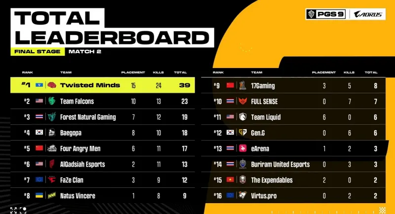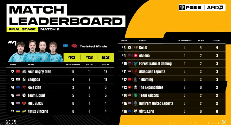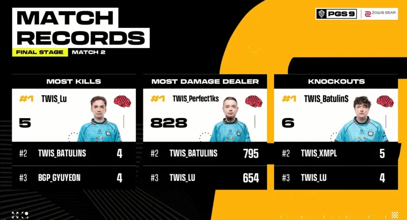 阶段8-梅花桩,TWIS依靠高坡点位逼走坡下的longz,后者进圈过程中被发现淘汰,随后TWIS4人依靠道具和地形及人数优势突进,无伤打掉4AM后点两人,完成吃鸡。