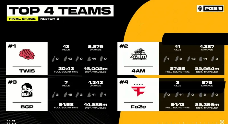 阶段7刷新后,FAZE被TWIS团灭,BGP和TL独狼被4AM淘汰,决赛圈4AM 4V4 TWIS,TWIS前点两人打掉高坡点位的Shen。