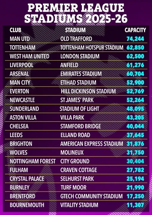 雷火官方10月17日讯 《太阳报》对比上个赛季和本赛季的英超手册,发现有五支英超俱乐部的球场容量较上赛季有所变化。