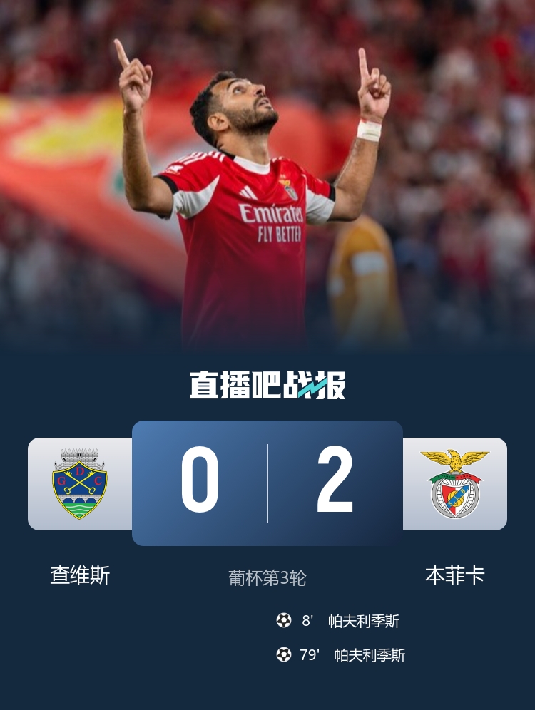 葡杯-本菲卡2-0查维斯晋级 帕夫利季斯世界波+双响苏达科夫献助攻