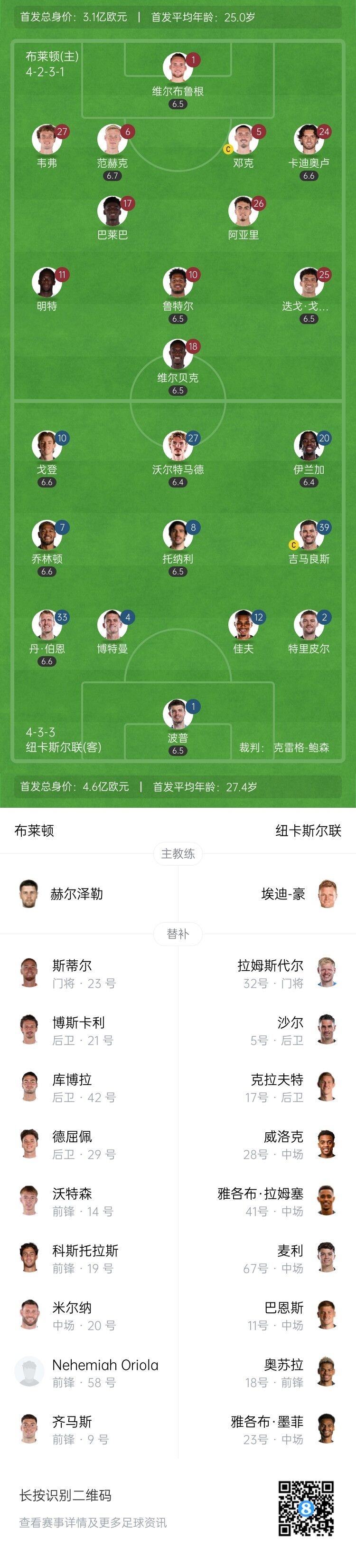 半场-布莱顿1-0纽卡斯尔 维尔贝克单刀破门鲁特尔远射造威胁