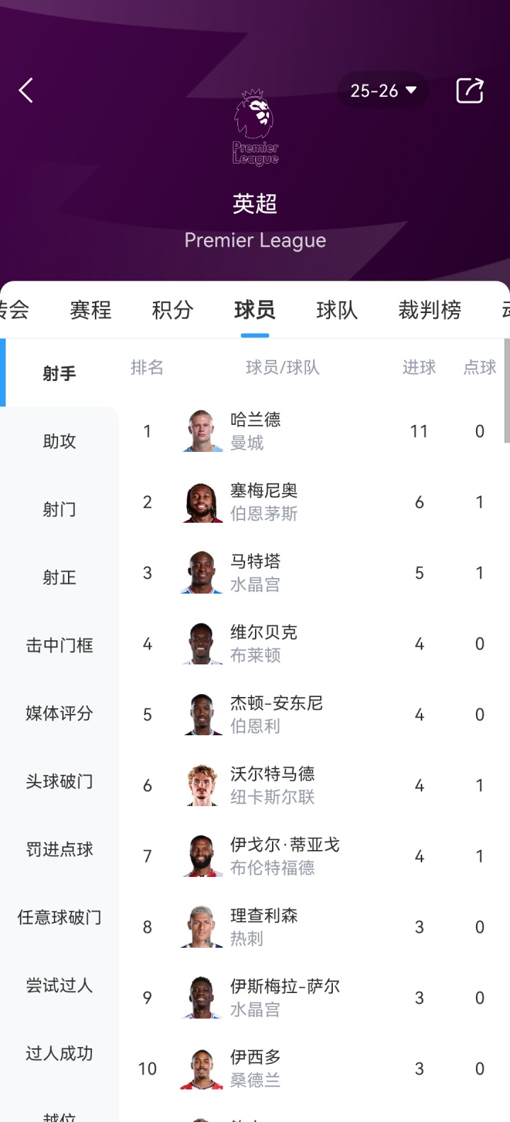 英超射手榜:哈兰德8轮11球领跑!塞梅尼奥6球第二马特塔5球第三