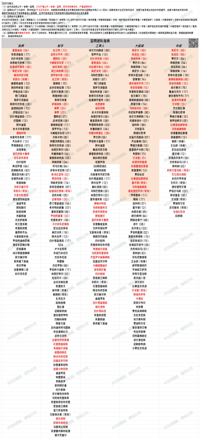 黄底代表该定位下球员具备名人堂强度,红字代表该定位下球员表现不错且具有性价比优先推荐