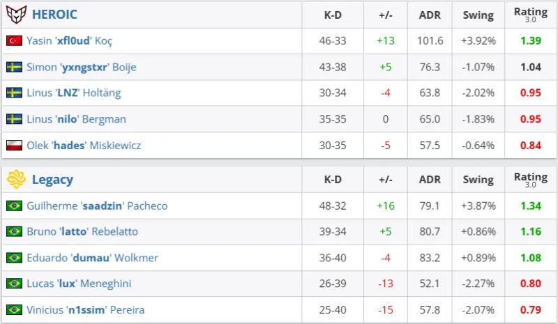 决胜图Inferno,两队上半场再次战胜6-6平,然而HEROIC却在赢下手枪局后惨遭Legacy强起翻盘,随后连续丢分直接被巴西人一鼓作气拿到赛点,虽然hades残局1v3挽救回一个赛点,但也难挽狂澜,最终Legacy以13-8再下一城,让一追二昂首挺进总决赛!