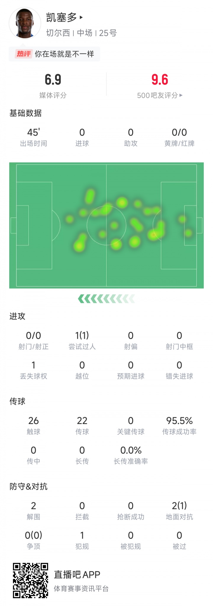 新晋世一腰!凯塞多半场仅1丢球权助蓝军3球完胜,1亿身价后腰第1