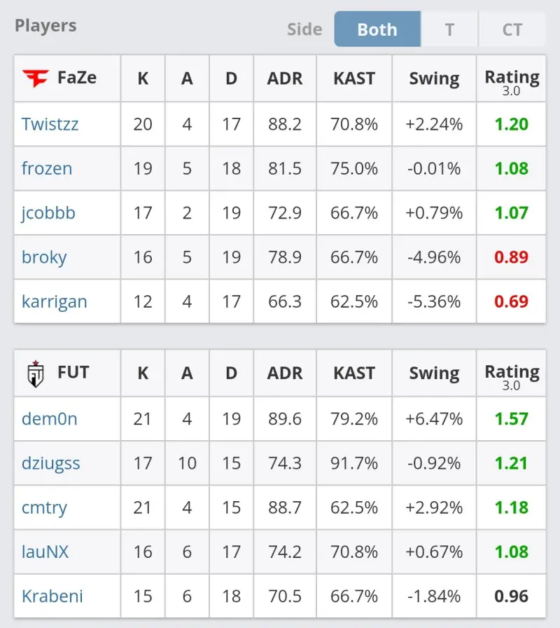 下半场易边再战,手枪局Faze假打A真打B,CT回防迅速,FUT拿下手枪局。第十四局Faze强起进攻A区,FUT有惊无险守住包点,Faze进入ECO局。第十五局,Faze全员发挥,无甲沙鹰ECO局翻盘止住颓势。第十七局,FUT经济局翻盘还以颜色。第十八局,Faze爆弹打A,FUT回防成功,Faze被迫叫出暂停。第十九局,Faze假打B真打A,进入包点未能下包,FUT连续拿分。第二十二局,demon先拿首杀,再击杀Twistzz,Faze二打五残局无力回天,FUT追平比分。第二十三局,lauNX拿到三杀,FUT连拿七分,反拿赛点。第二十四局,FUT防守拉满,团灭Faze,13-11拿下比赛。