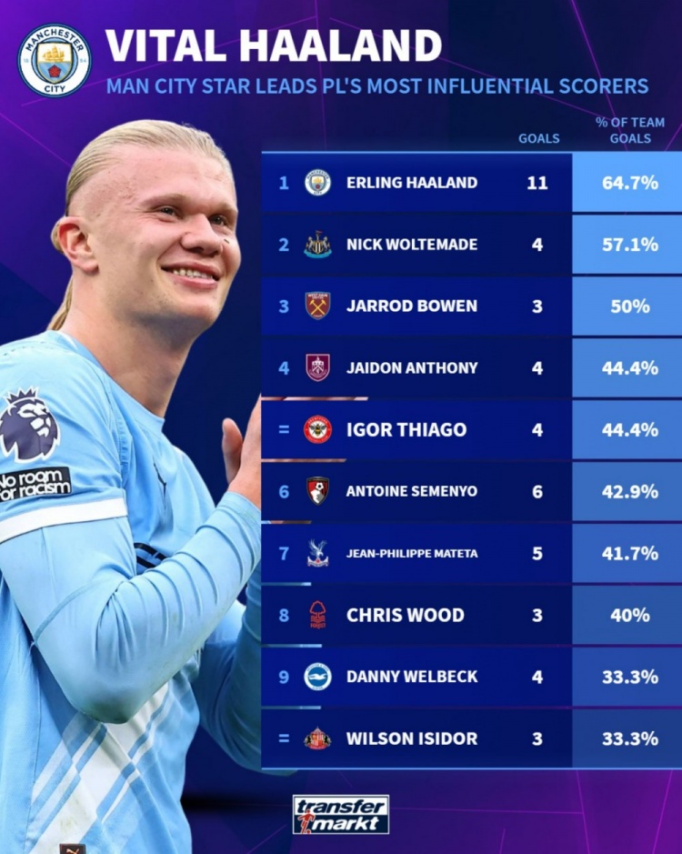 哈兰德本赛季英超11球占曼城全队64.7%,单人进球占比领跑英超